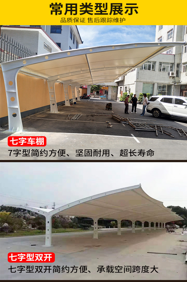 由于高强度膜材的出现,再加上张拉技术的应用,使膜结构车棚抵御风雨的能力是一般雨蓬所不可比拟的。一般膜材使用寿命可达15年以上。有的车棚采用永久性膜材,可以使用三、四十年。特别是遇到剧烈的暴风雨天气,膜结构建筑岿然不动,毫发不损。